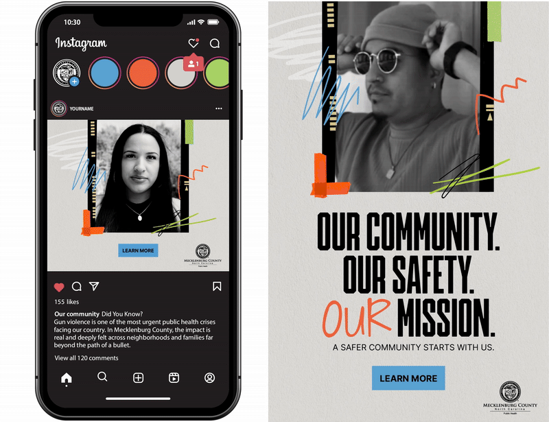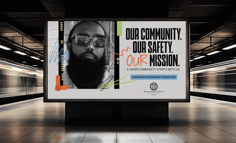 Partnering again with Sr. Art Director Jen Forrest, we established the look and feel for Mecklenburg County’s Office of Violence Prevention campaign. Together we developed a bold, community-forward identity that came to life across TV spots, video, digital, billboards, bus wraps and merchandise—building a cohesive, impactful presence that raised awareness and inspired action.
