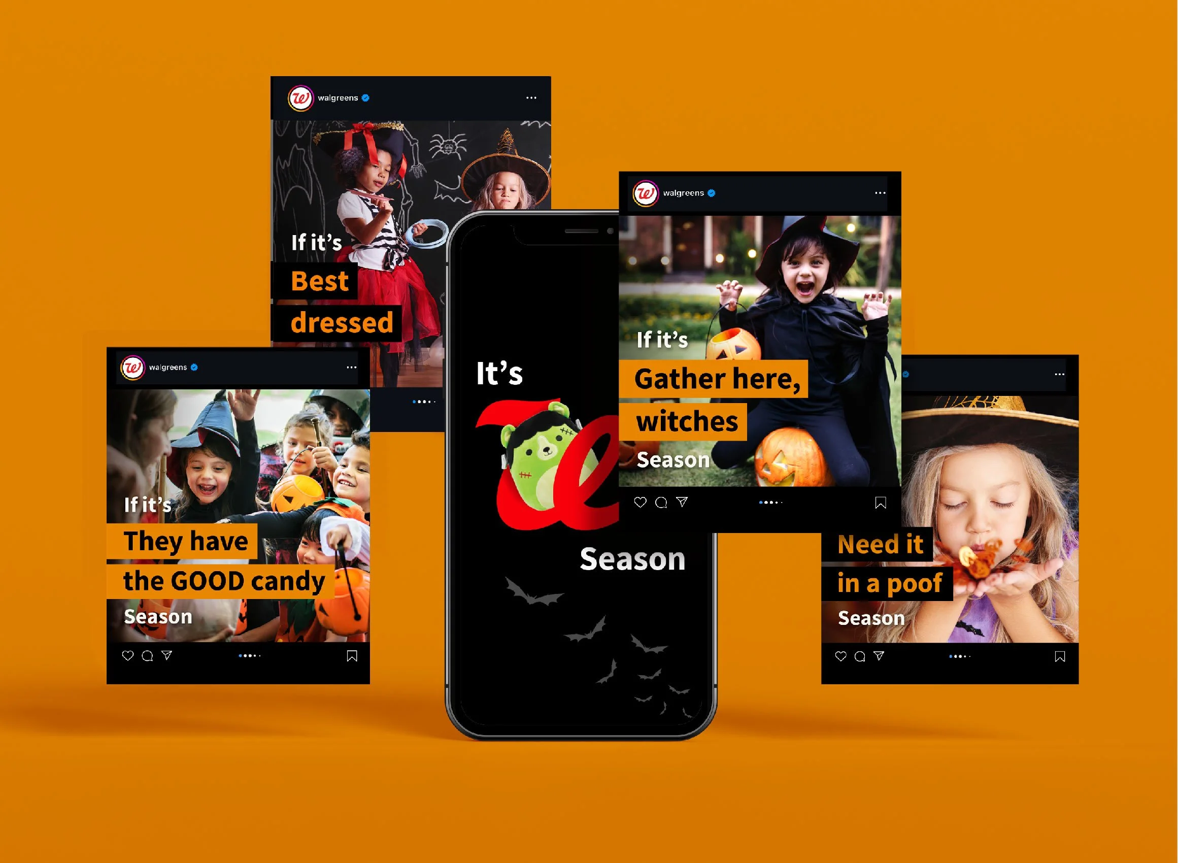 Alongside social content, I created print and digital asset libraries for It’s Walgreens Season—including layouts, illustrative elements, logo treatments, messaging hierarchy and photography that captured the festive, playful spirit of Halloween.